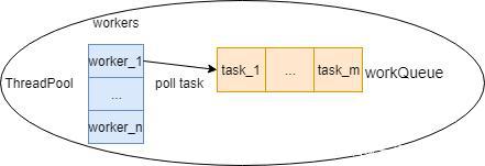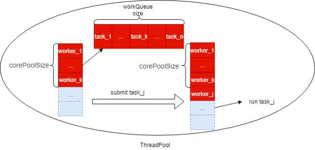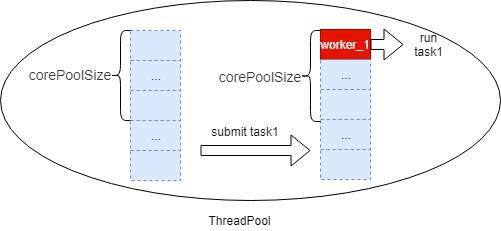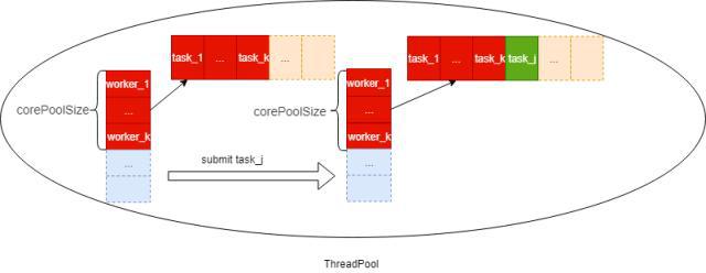 - 线程池中线程数量小于corePoolSize,此时任务不会进等待队列,线程池直接创建一个线程Worker执行提交的任务;