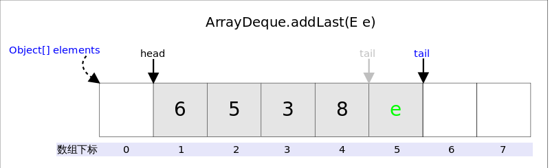 addLast(E e) 的作用是在Deque的尾端插入元素,也就是在 tail 的位置插入元素,由于 tail 总是指向下一个可以插入的空位,因此只需要 elements[tail] = e; 即可。插入完成后再检查空间,如果空间已经用光,则调用 doubleCapacity() 进行扩容。