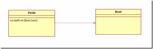 概念:是一种 使用 的关系,即一个类的实现需要另一个类的协助,所以要尽量不使用双向的互相依赖,在程序中一般表现为类 A 中的方法需要类 B 的实例作为其参数或者变量,而类 A 本身并不需要引用类 B 的实例作为其成员变量。