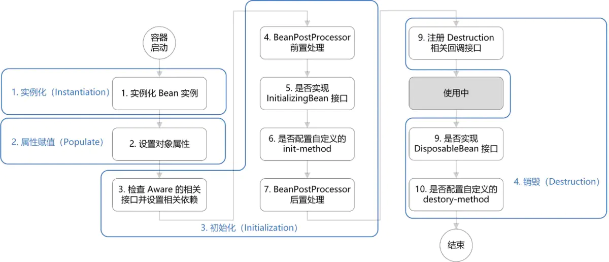 - 初始化(Initialization):有Aware接口的依赖注入、BeanPostProcessor在初始化前后的处理以及InitializingBean和init-method的初始化操作。